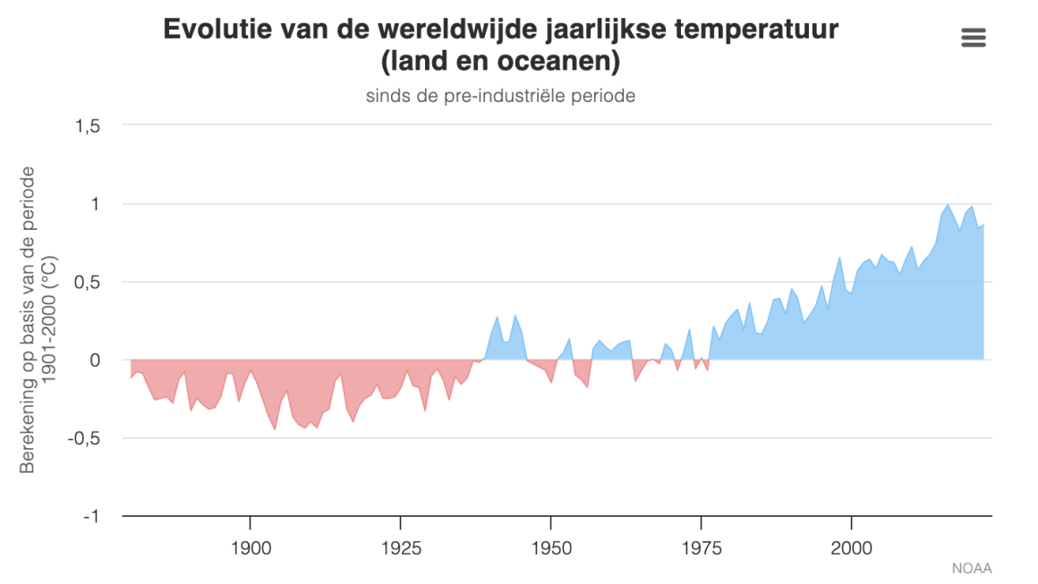 Deze grafiek toont voor elk jaar de afwijking van de gemiddelde jaartemperatuur t.o.v. de gemiddelde temperatuur in de de 20ste eeuw (de 0-lijn). Bron: Klimaat.be